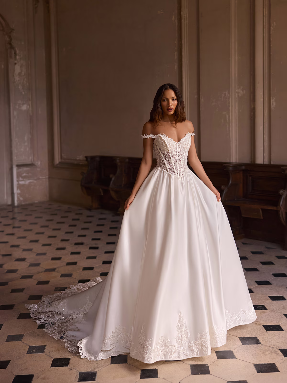 Meet Style H1624. Coming in a grand ball gown silhouette, this wedding dress with off the shoulder detachable lace sleeves is remarkable in every way. The classic sweetheart neckline paired with both embroidered and beaded patterns is the definition of lavish. You can wear the sleeves during the formal ceremony for an off the shoulder style, then remove them once the sun sets and you’re ready to dance.