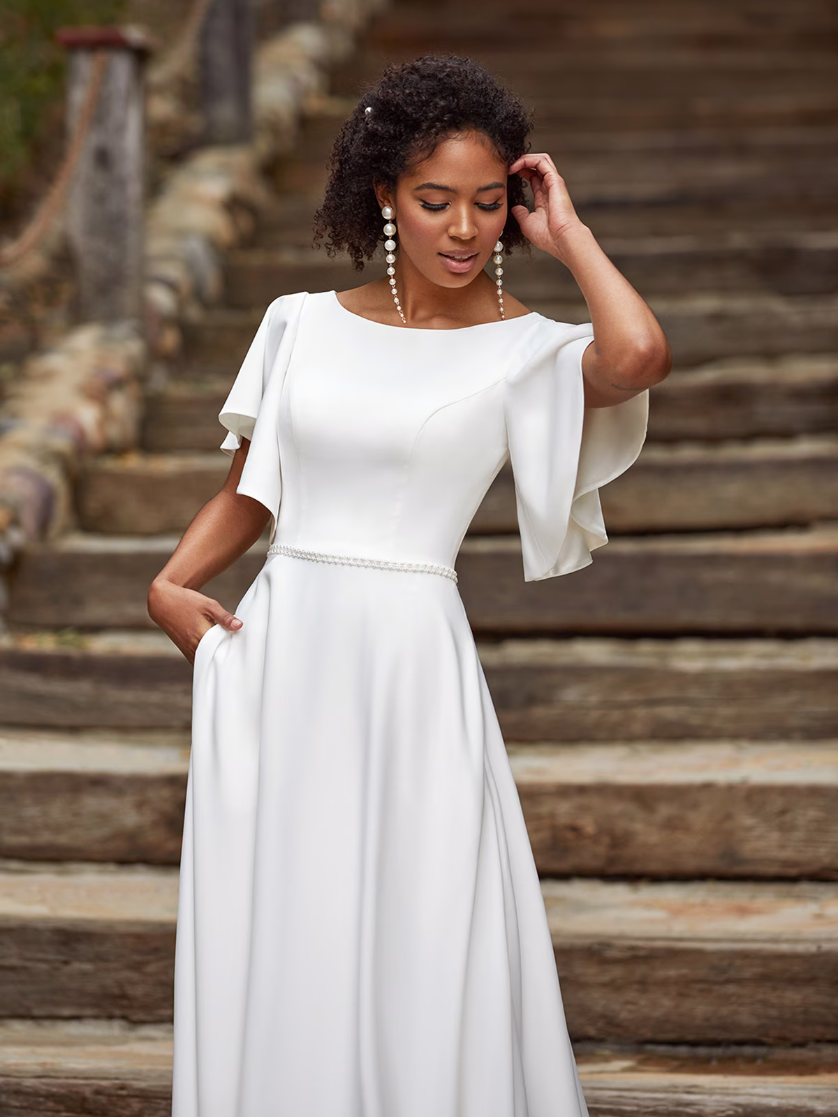 Flowing crepe gown with flutter sleeves