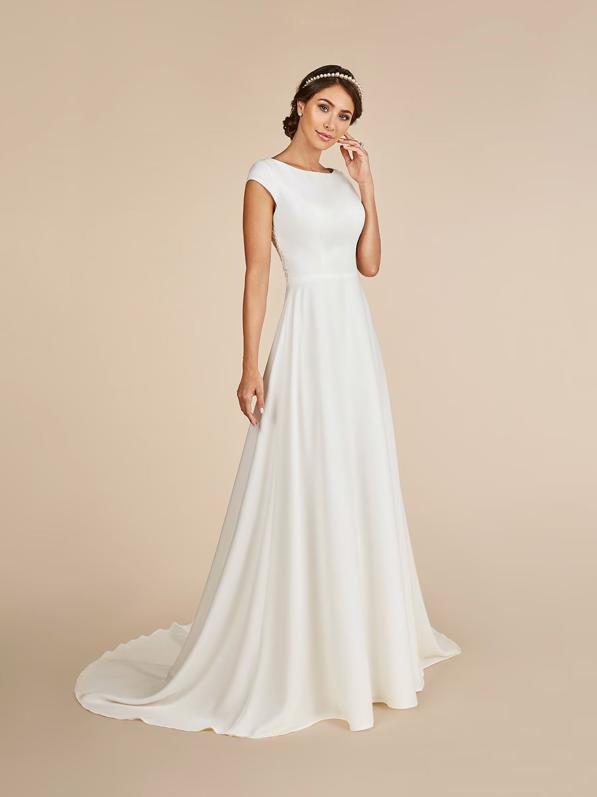 Soft crepe back satin dress featuring a bateau neckline and cap sleeves