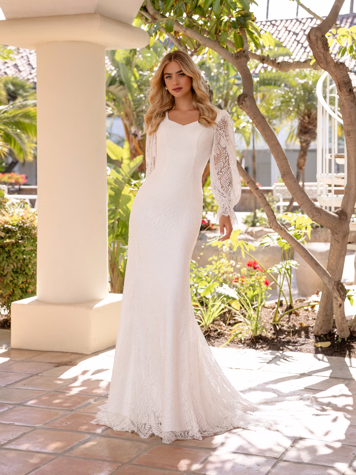 A classic all-over lace style with a rustic feel is a great option to consider. You will still feel like a bride with the fabulous lace fabric but have a bit more of a casual feel that will fit the setting perfectly. Consider our Style M5105 , a nature-inspired lace gown with a mermaid silhouette, long bishop sleeves, and a lined sweetheart neckline.
